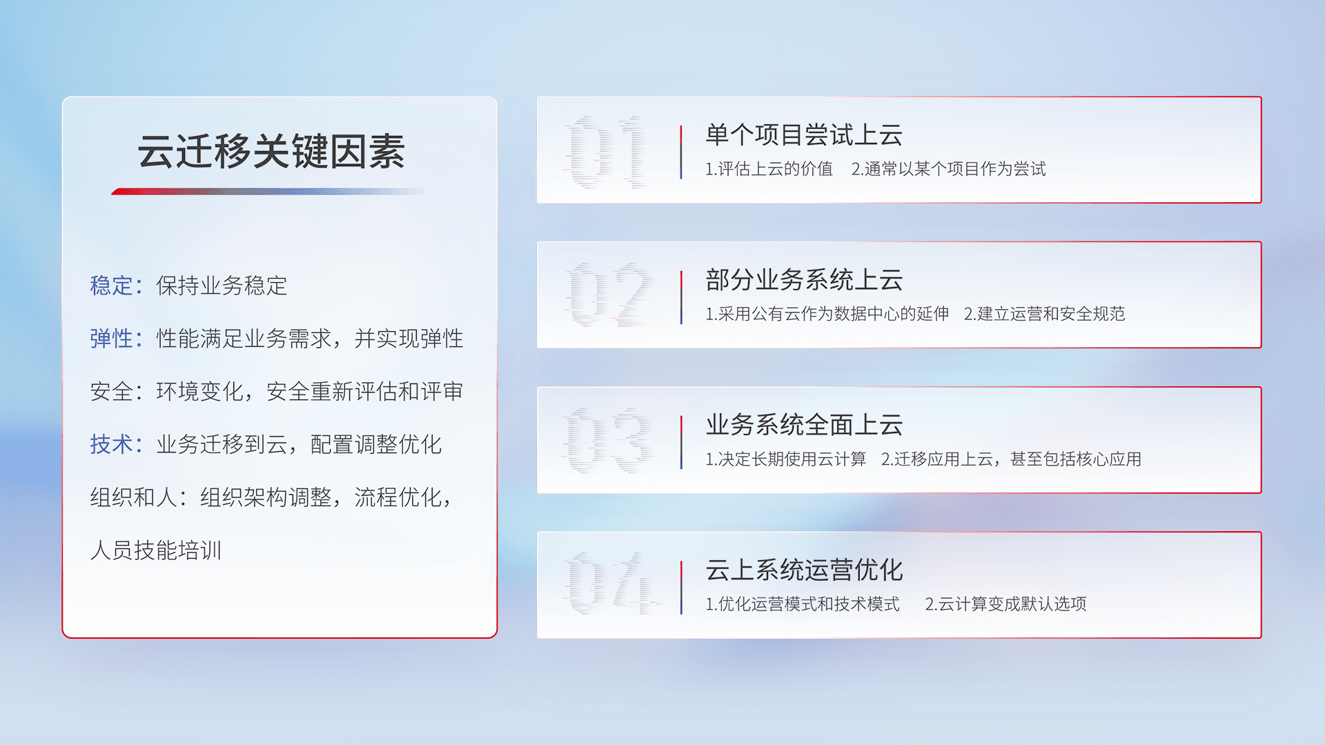 结合实际业务,,,,从规划设计、、、云平台选型、、、、云原生改造、、数据迁移、、集成交付,,迁移全过程为客户识别最佳上云路径,,,做好风险识别管理,,,,设计网络架构、、、身份权限、、、、安全审计合规、、操作审计、、、、日志审计、、监控告警策略、、多站点容灾设计等,,,,对云上基础设施进行整体规划,,,,提升IT治理水平,,以满足弹性、、高可用、、、高性能的需求。。。。